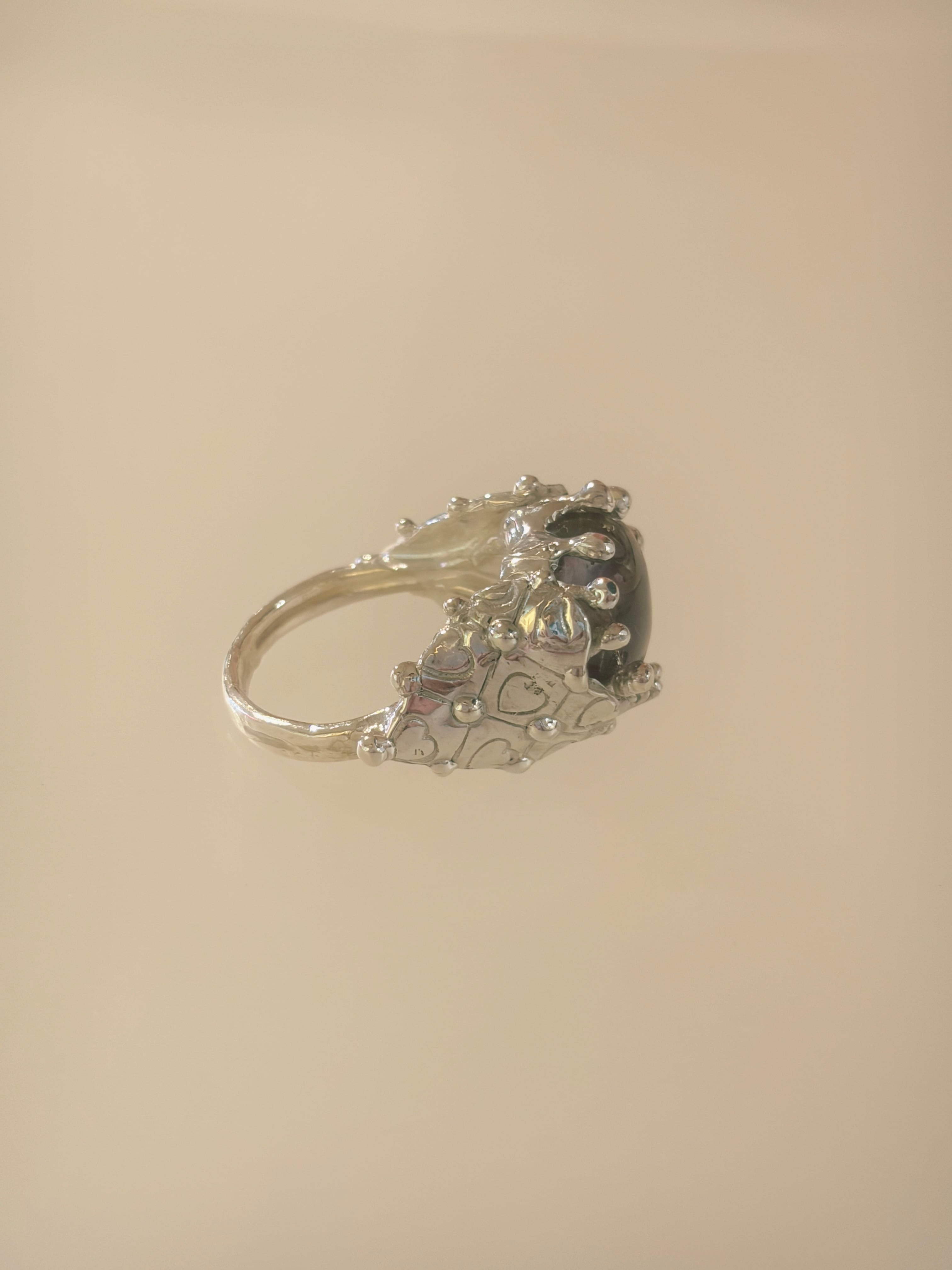 This cabochon reveals a mysterious charm through its inclusions and softly shifting gradient hues, set into a design ring adorned with plenty of heart motifs.